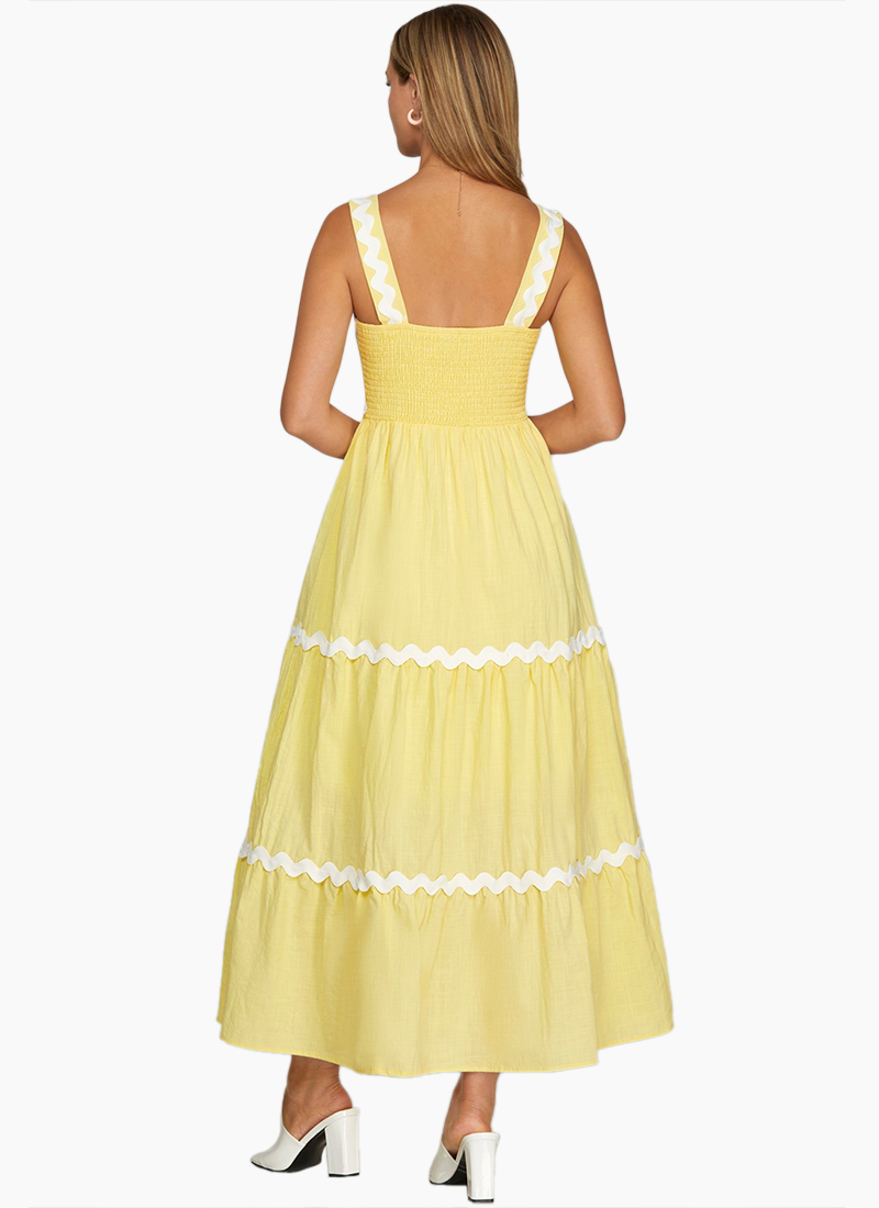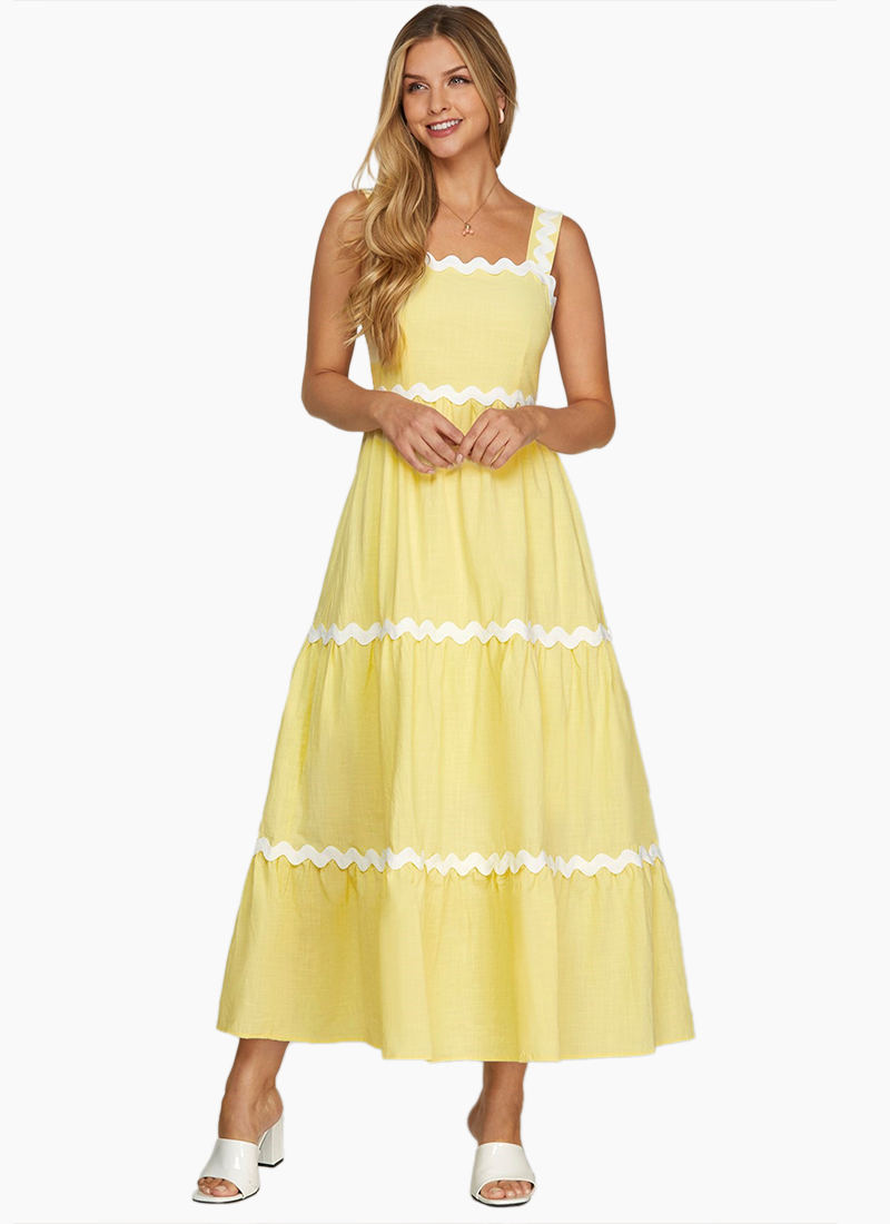 A cheerful rickrack design enlivens this crisp cotton blend midi designed with a modern square neck.