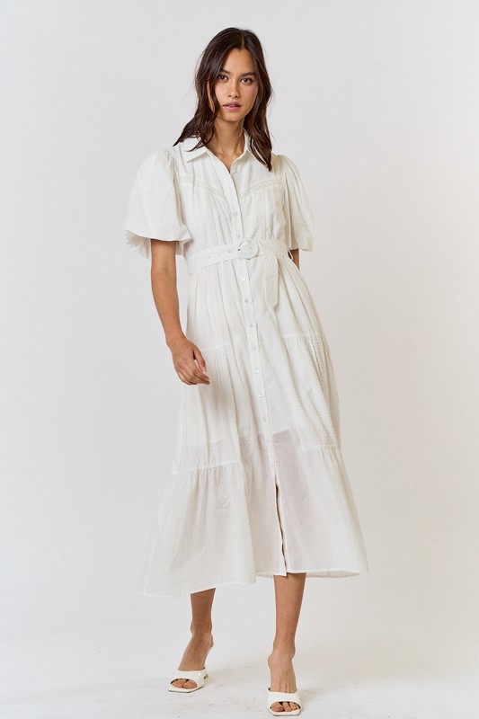 Cotton eyelet belted Swiss dot midi shirt dress.