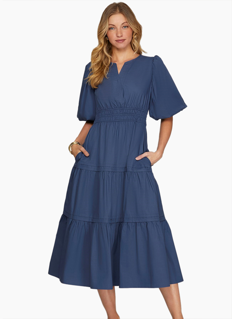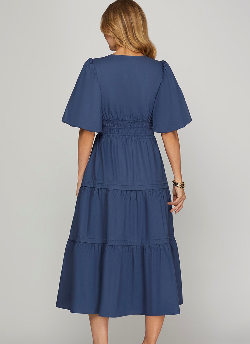 Crisp V-neck cotton midi dress designed in a breezy fit-and-flare silhouette framed by balloon half sleeves.