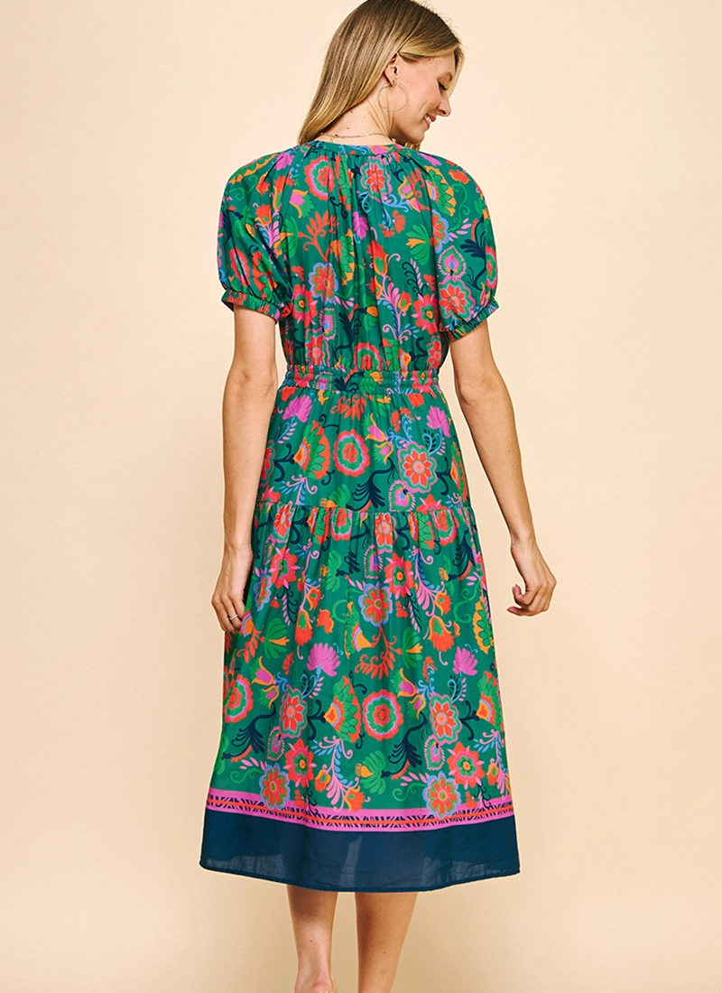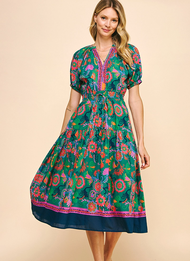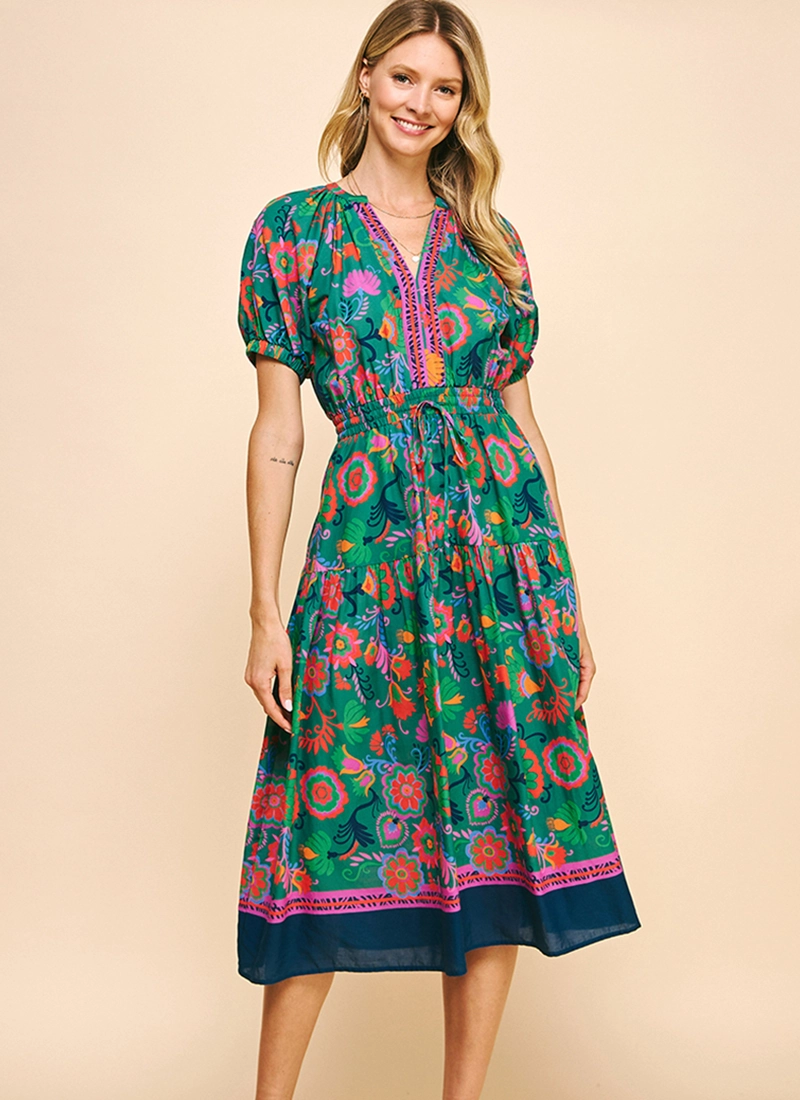 Floral bordered print details this all-cotton dress sweetened with a smocked waist and accented with puff sleeves.