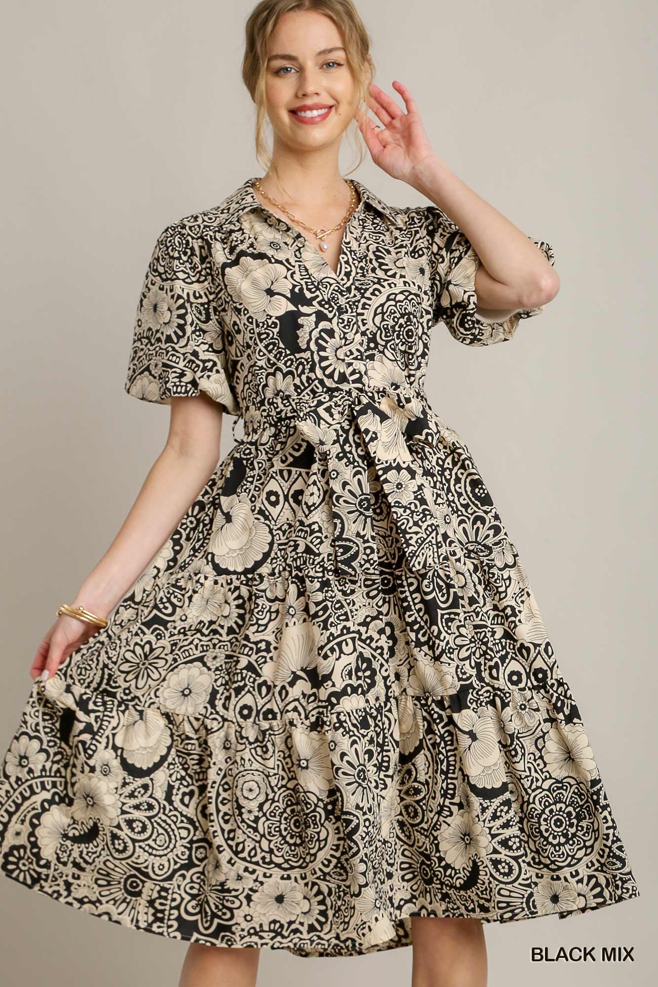 Print A-line tiered midi dress with short puff sleeves & waist tie belt.