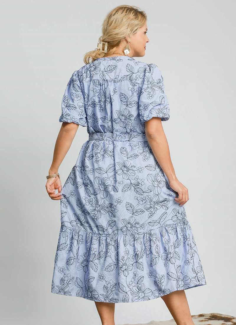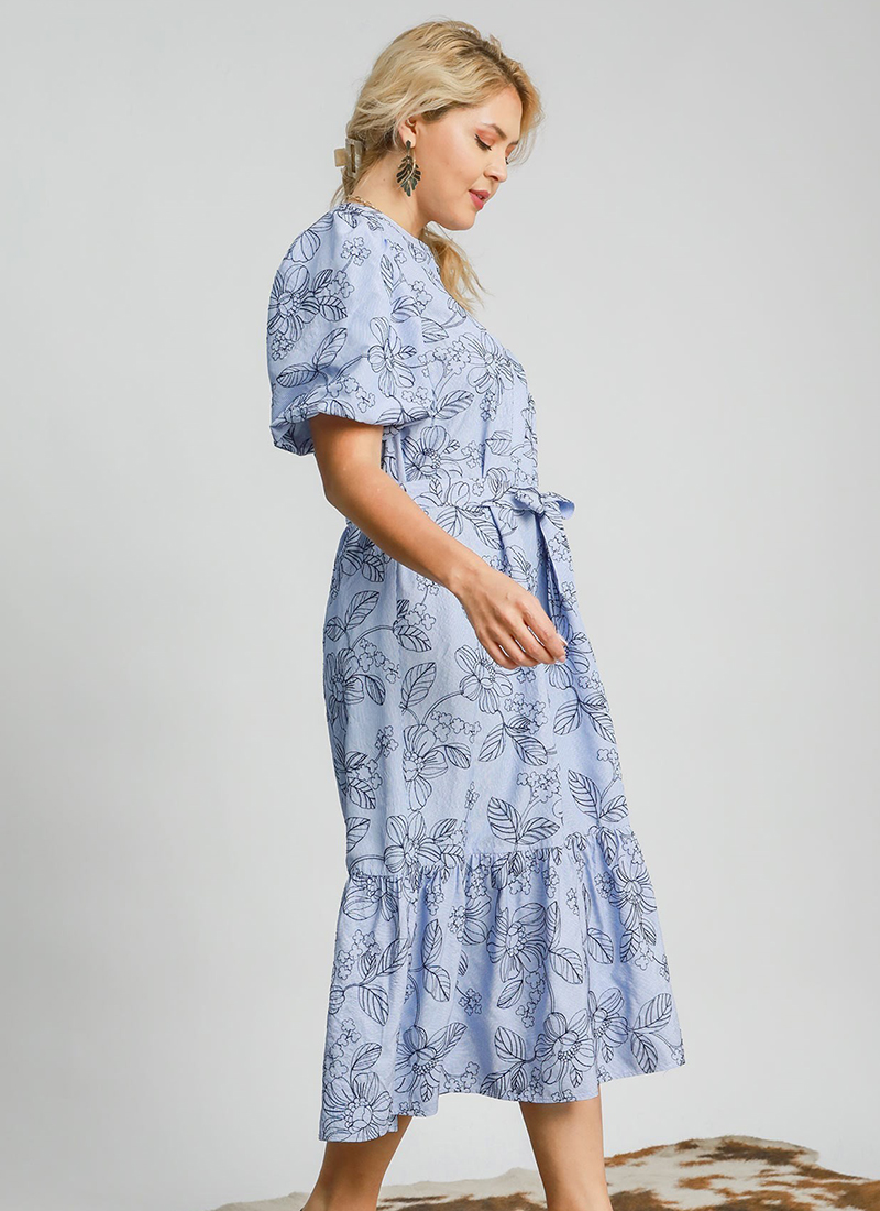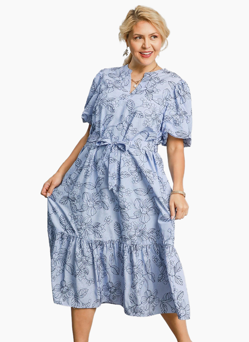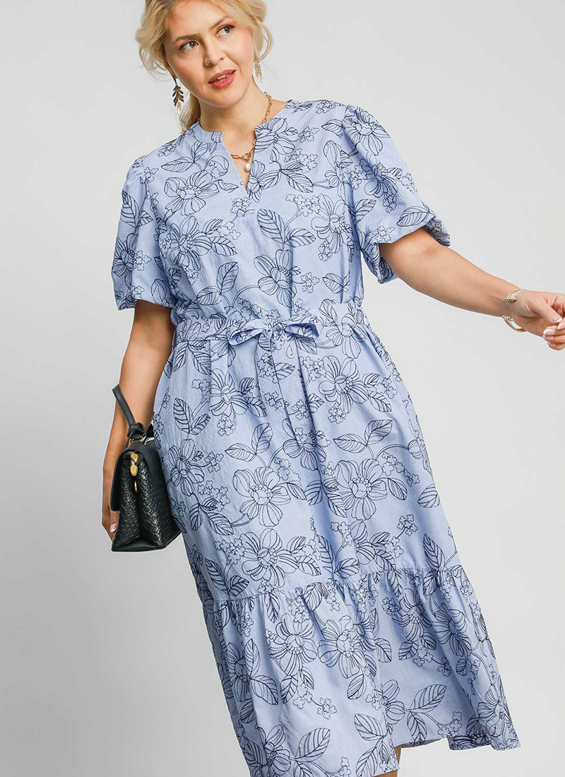 Pretty puffed sleeves frame this lightweight cotton blend midi dress decorated in delightful blooms and tethered at the waist by a matching removable tie belt.