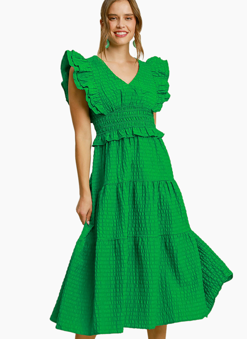 Ruffles and frills work with vibrant V neck dress you'll wear on repeat.