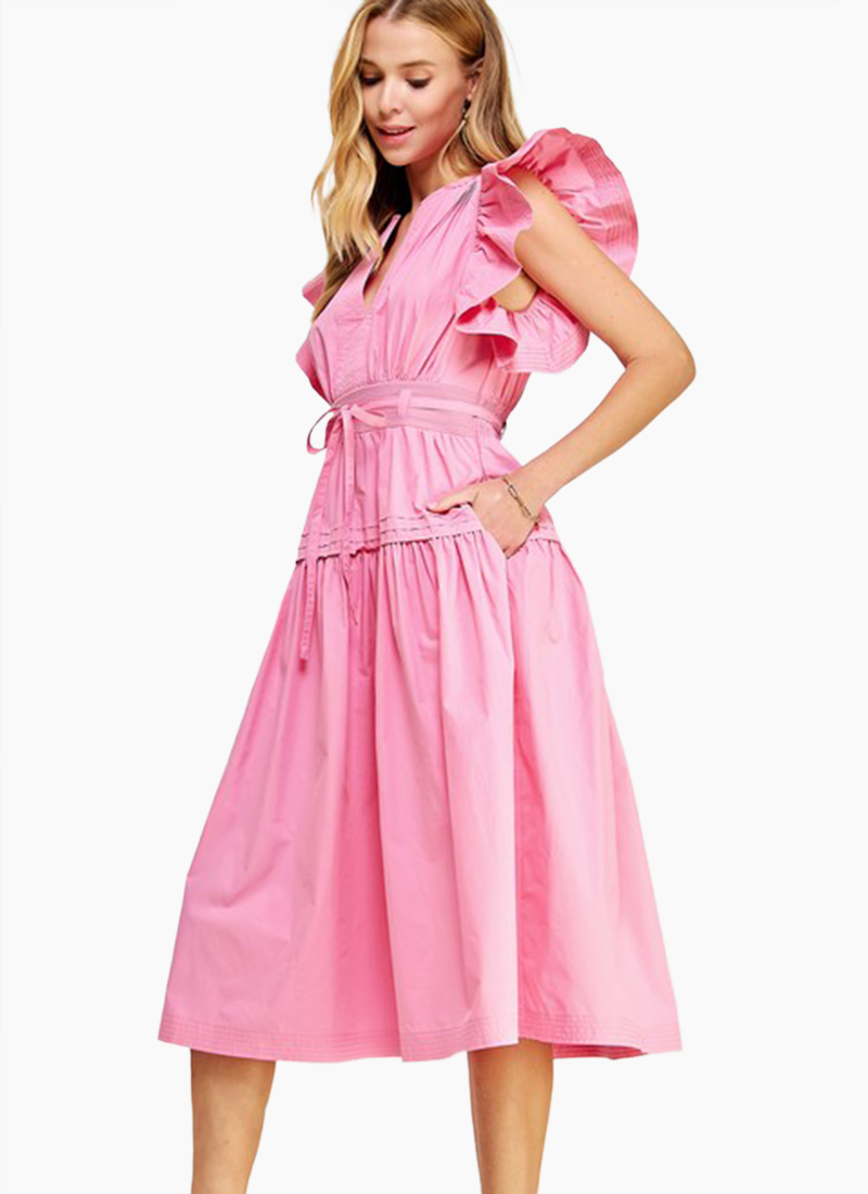 Ruffles & pintuck detail perfectly frame this midi dress cut from crisp cotton for a sunshine-ready look.