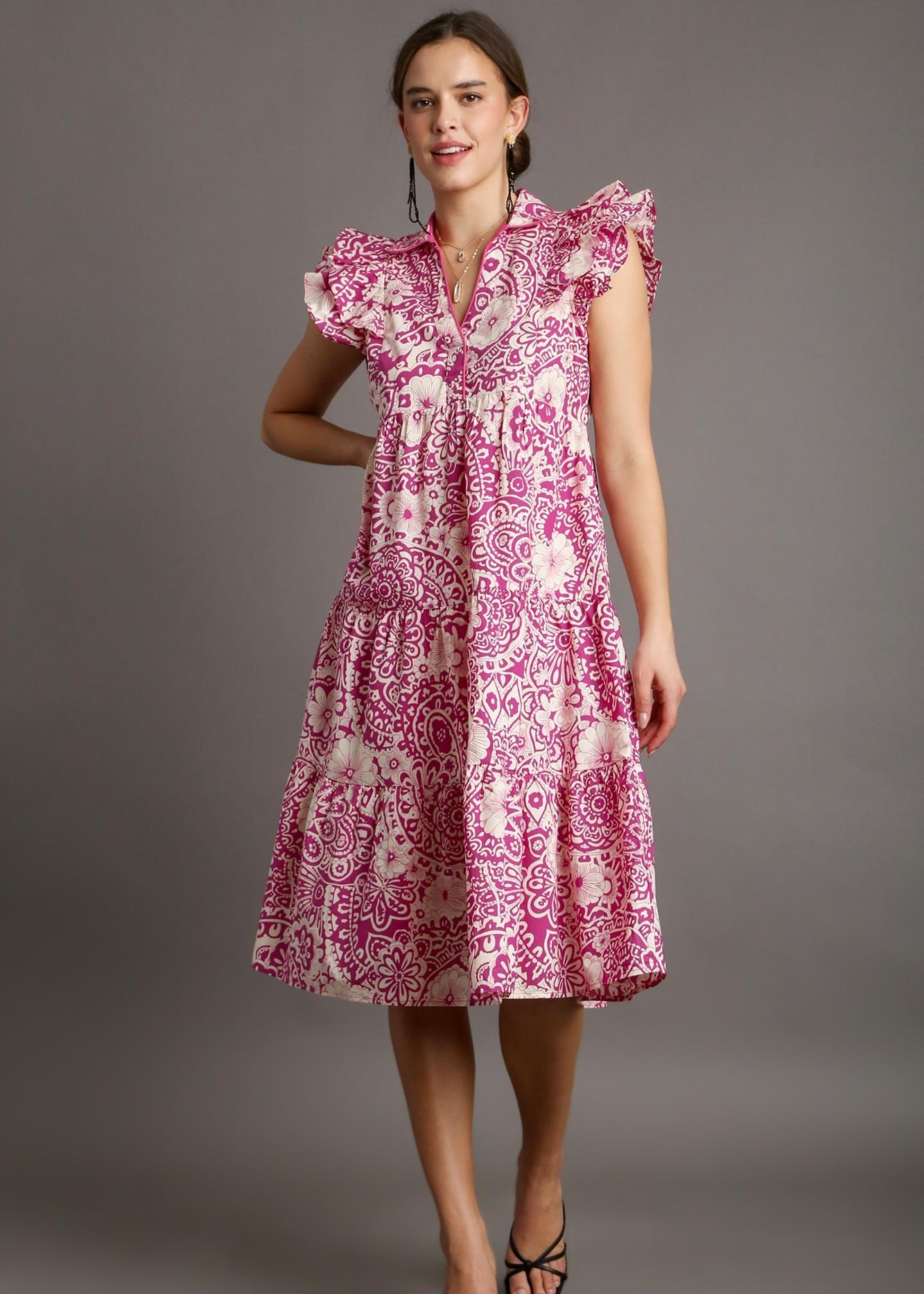 Paisley print A-line tiered midi dress with flutter sleeves