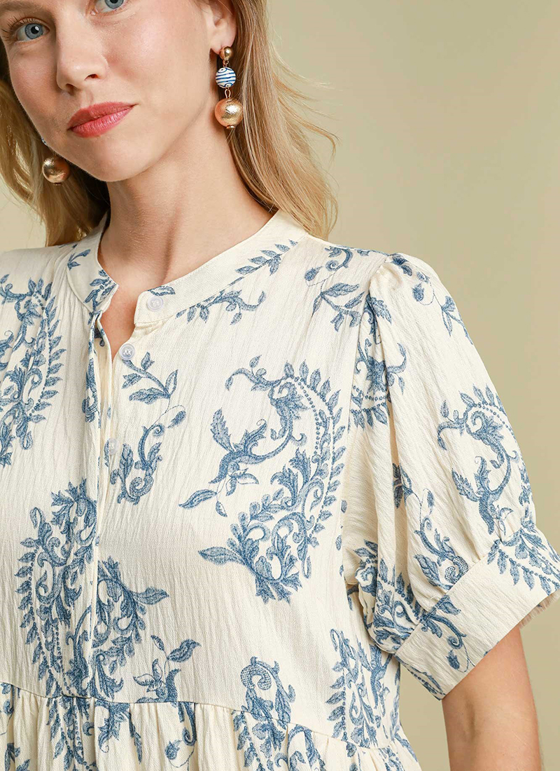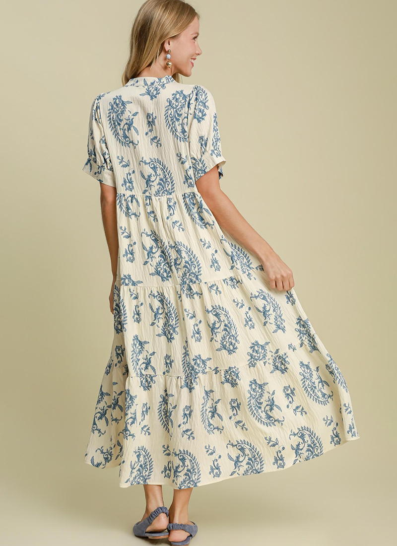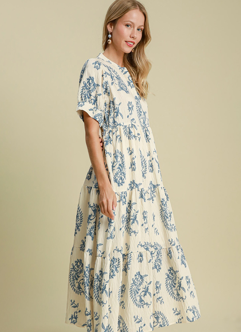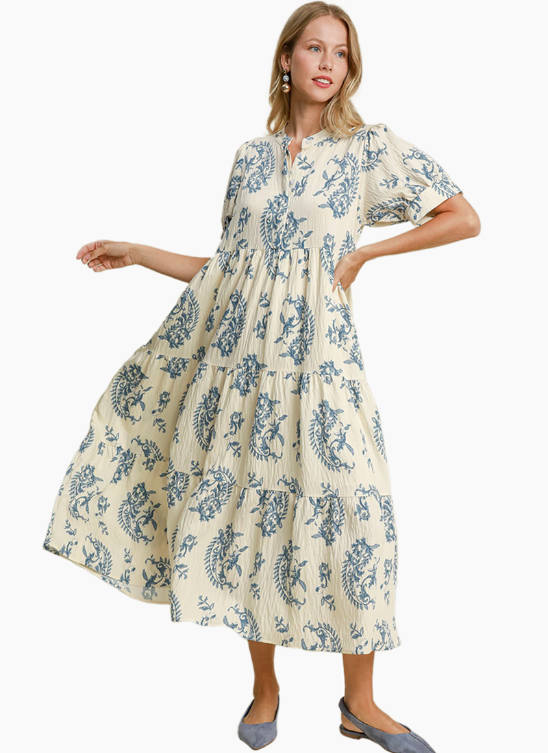 A pretty print, tiered skirt & mandarin collar makes this midi dress a great addition to your everyday wardrobe.
