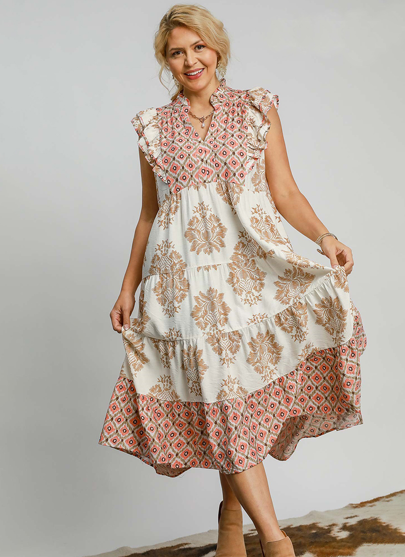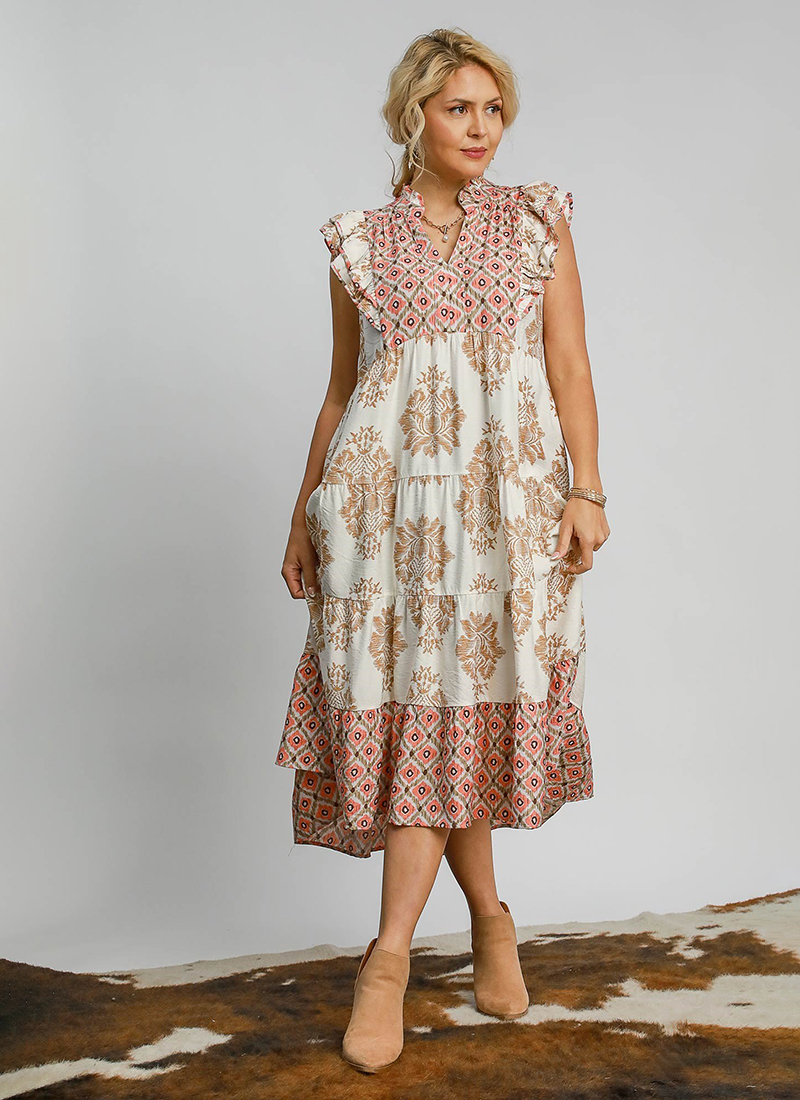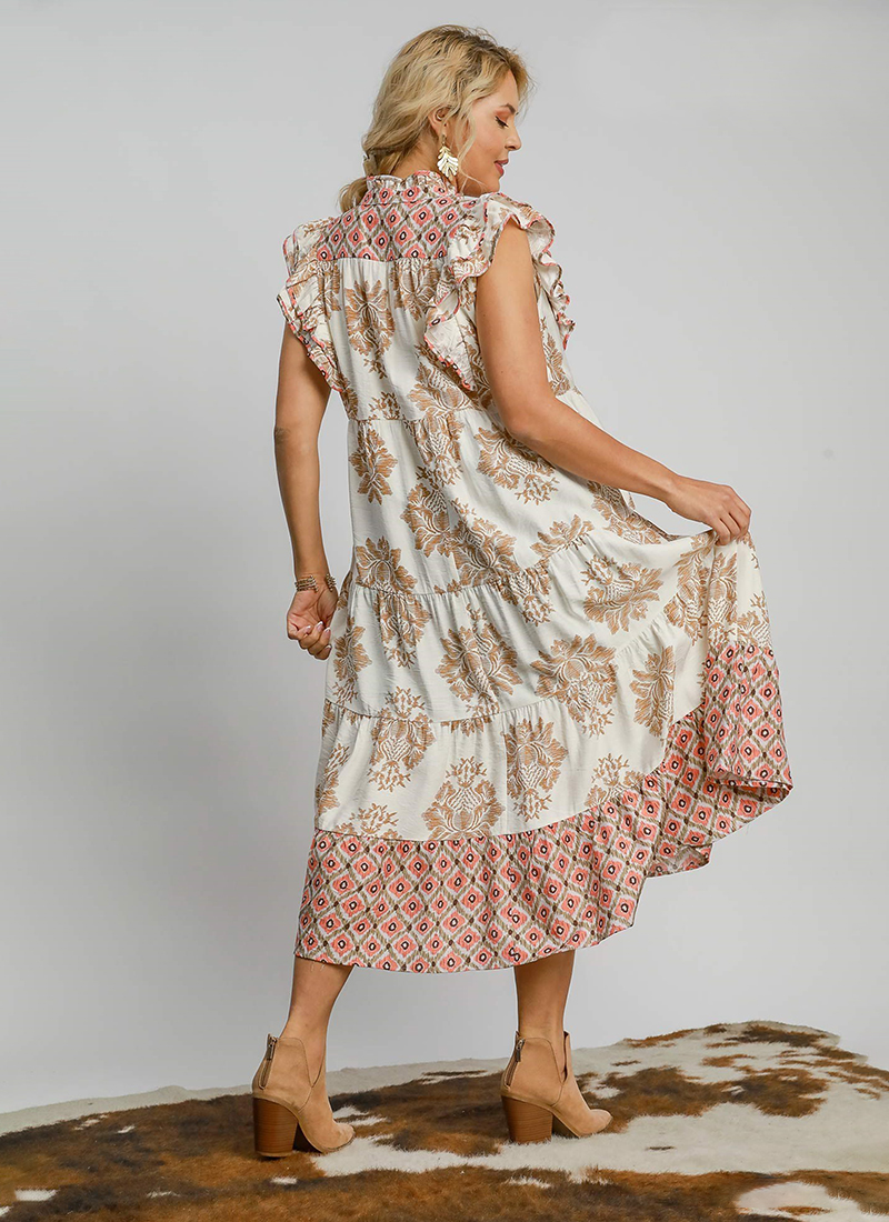 Mixed print midi dress with contrast binding & tiered skirt