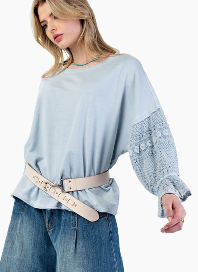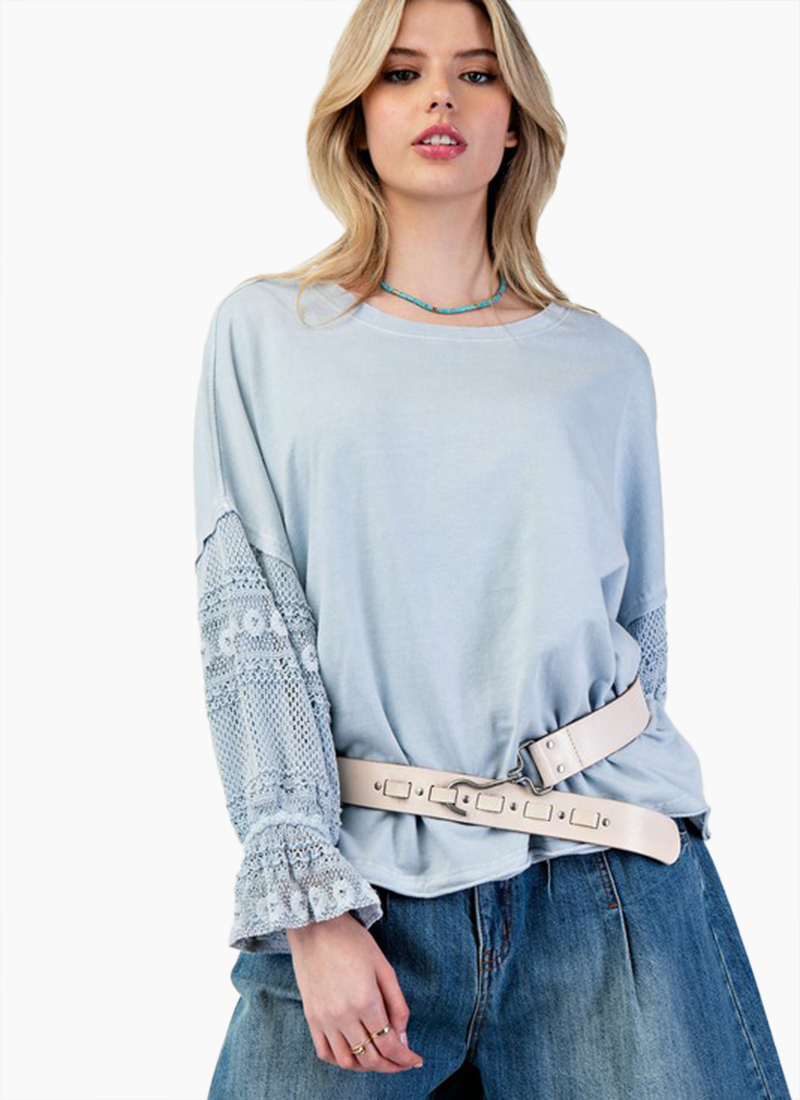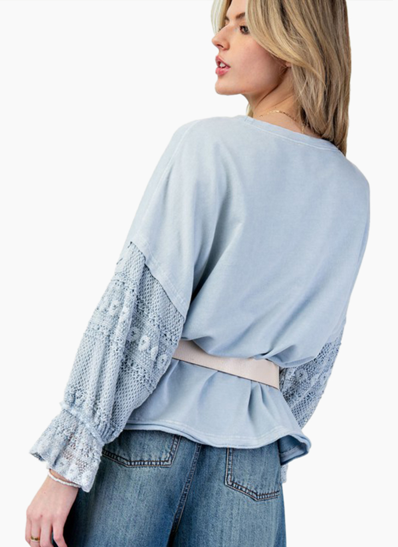 Relaxed fit lace sleeve mineral washed terry knit sweatshirt with ruched cuffs & raw cut hem. Drop shoulder
