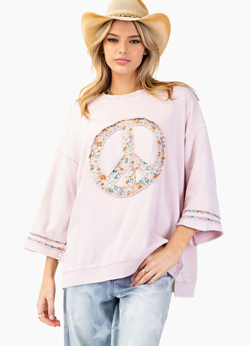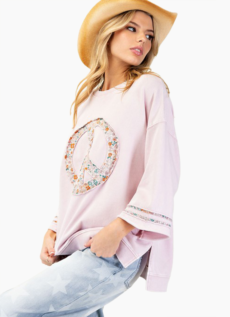 Peace patch mineral washed terry knit sweatshirt 3/4 sleeves with dropped shoulders Floral print detailing Relaxed oversized fit with side slits
