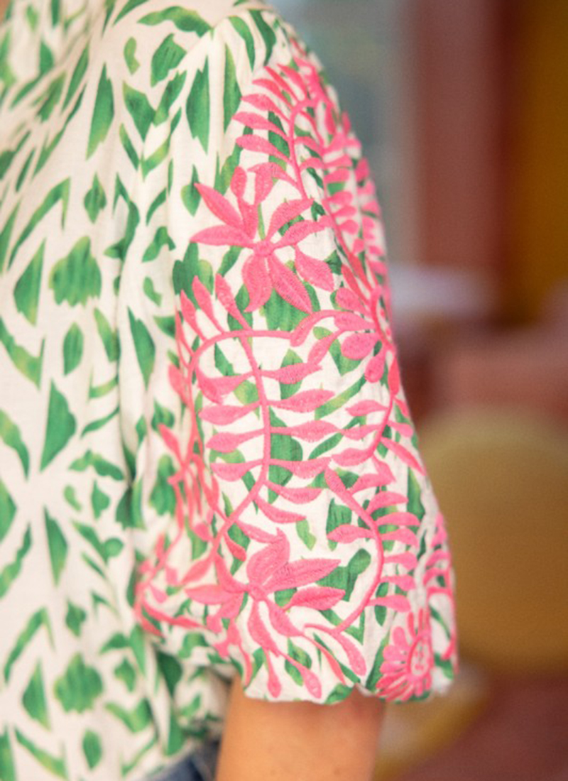 Contrast colour floral shirt with embroidered puff sleeves