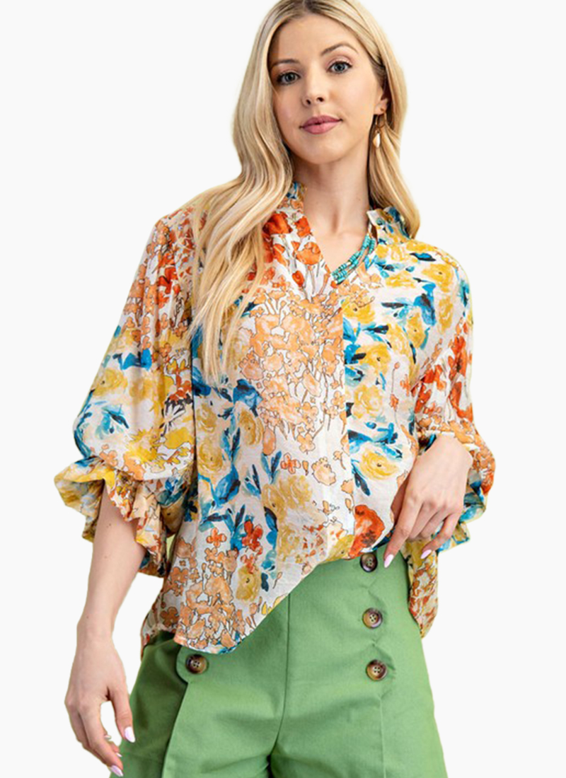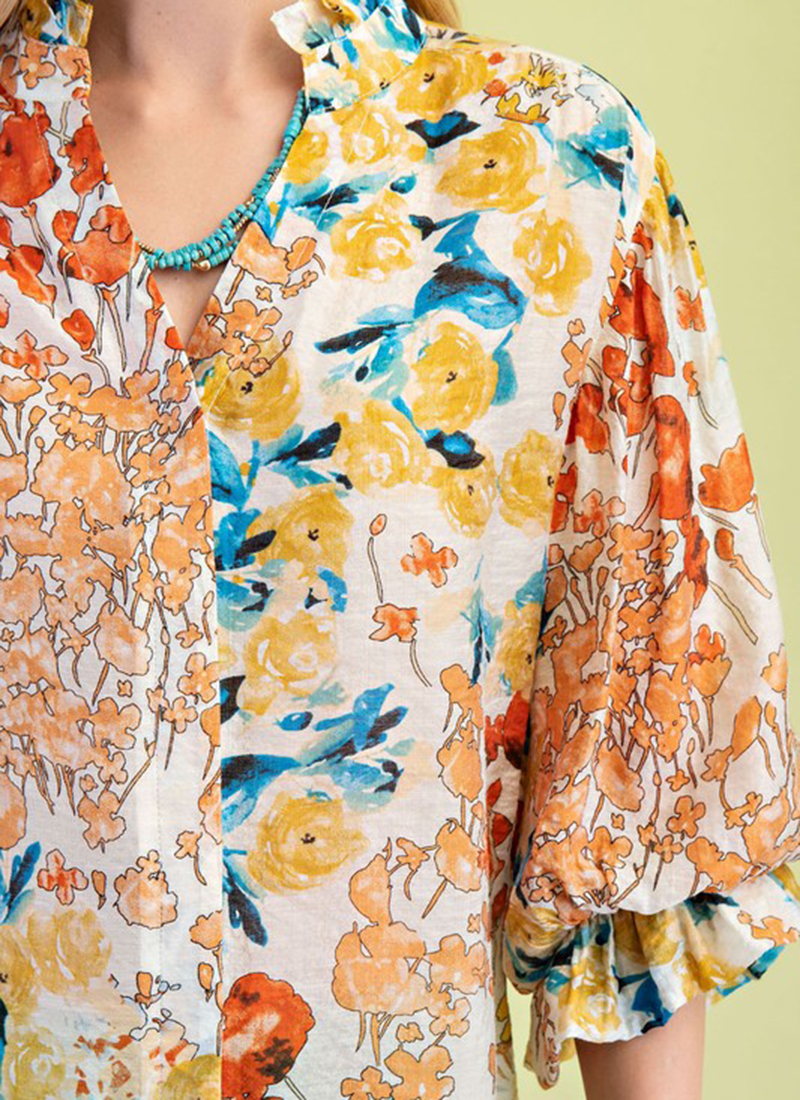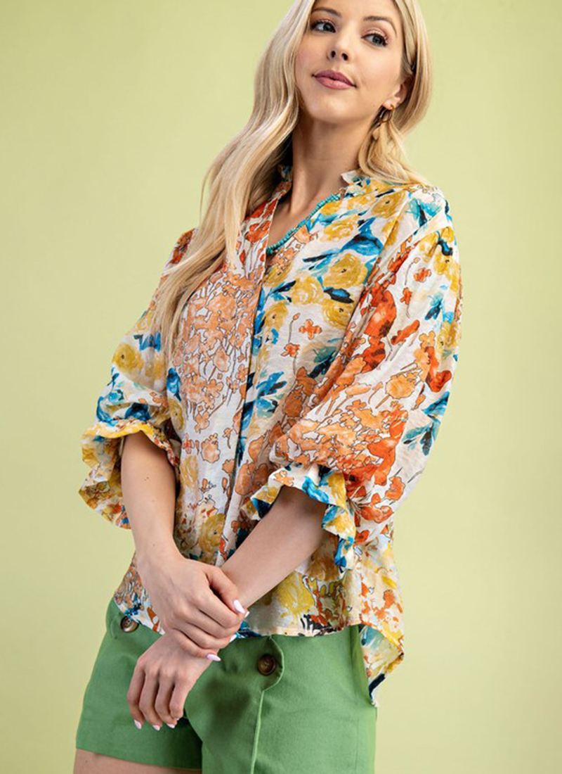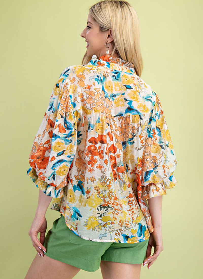 Floral Print Button Down Top with 3/4 Length Gathered Balloon Sleeves