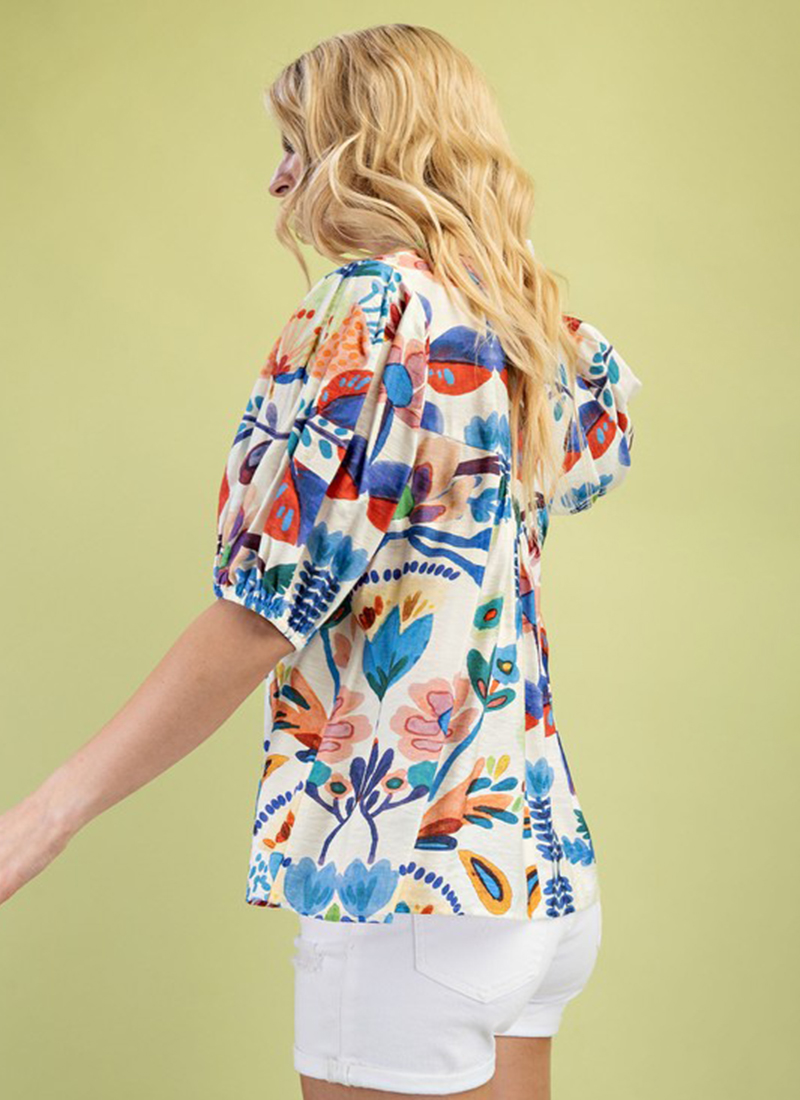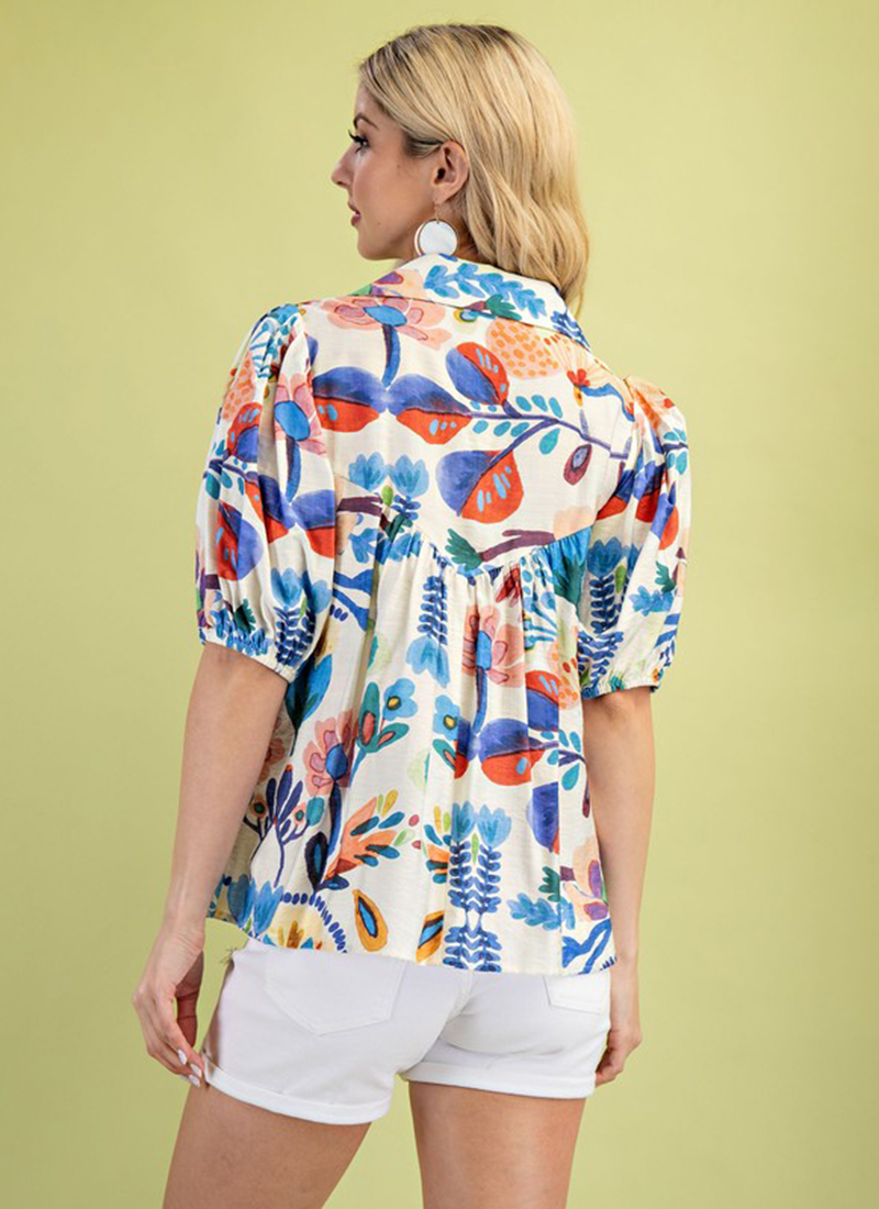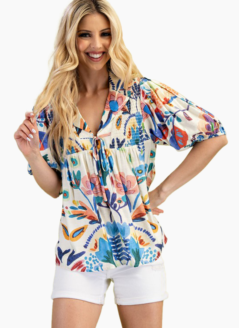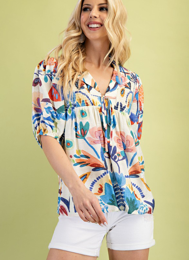 Collared Blouse with Tie Strings and Smocking on Front Yoke