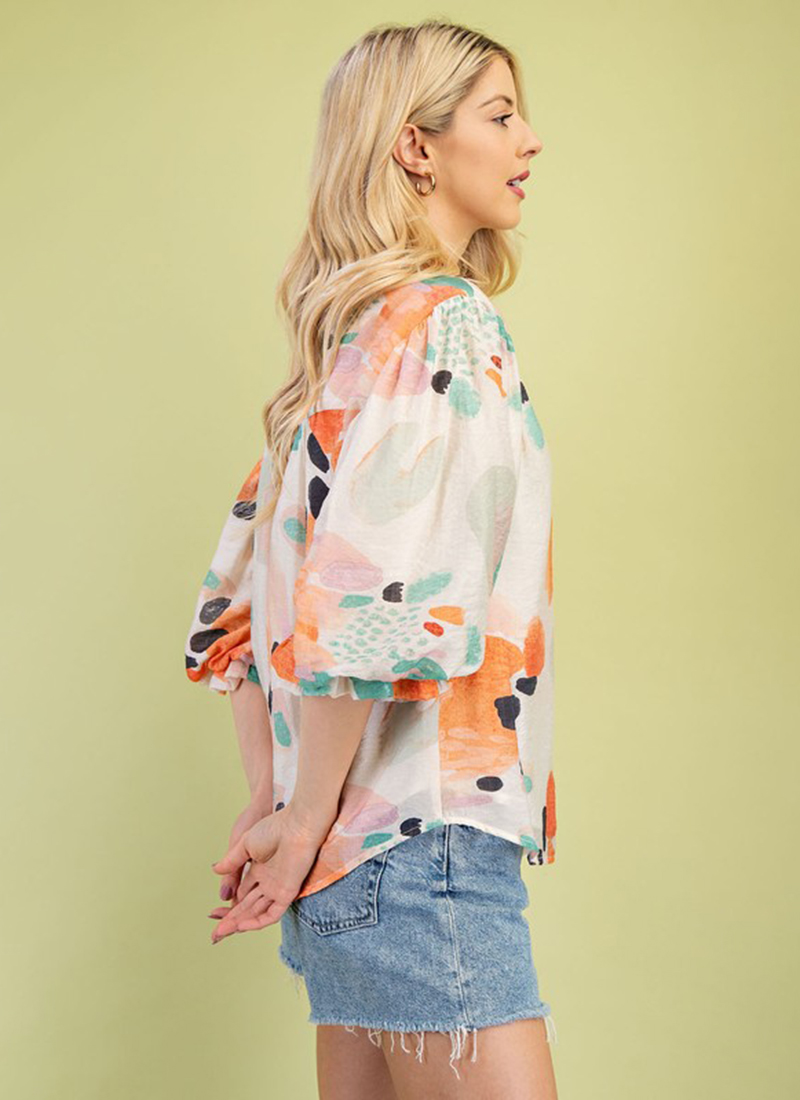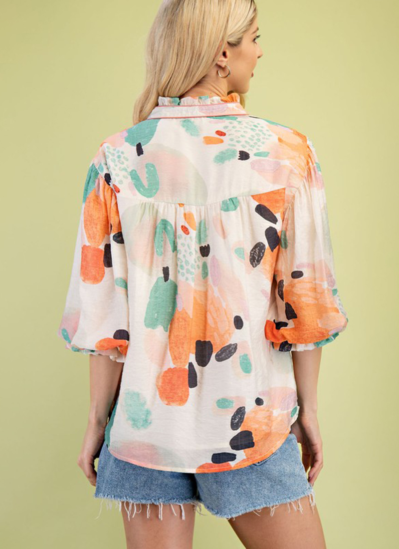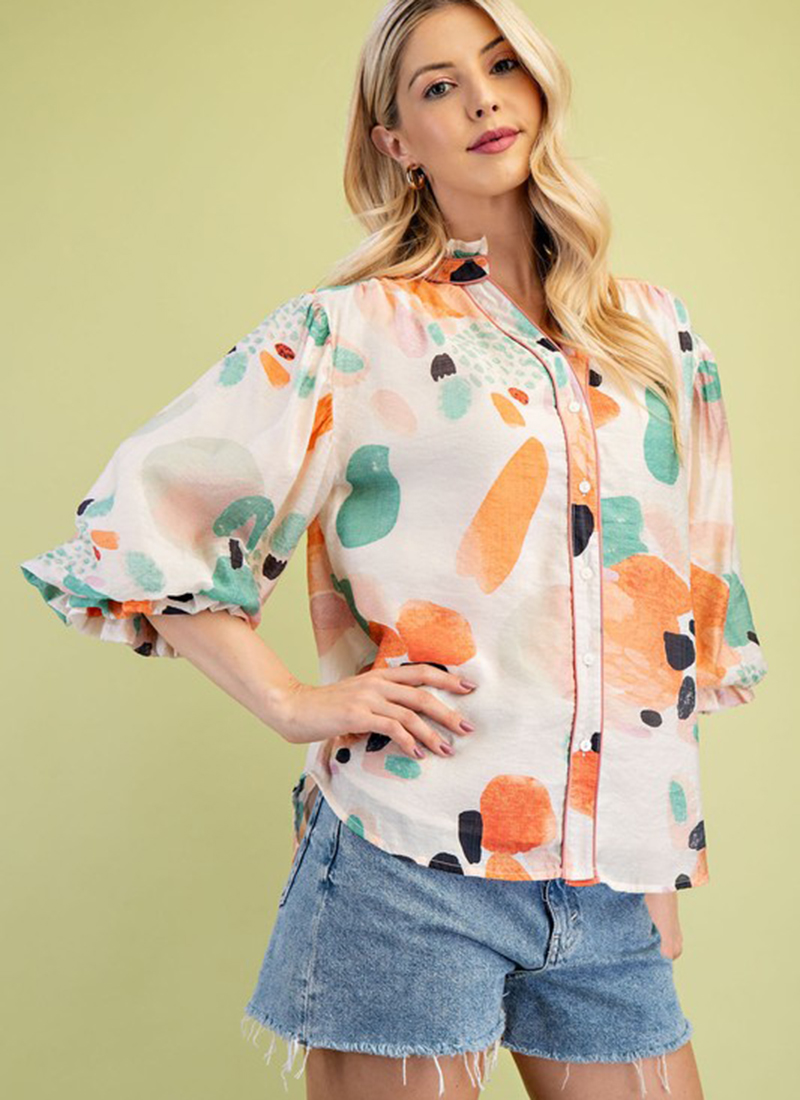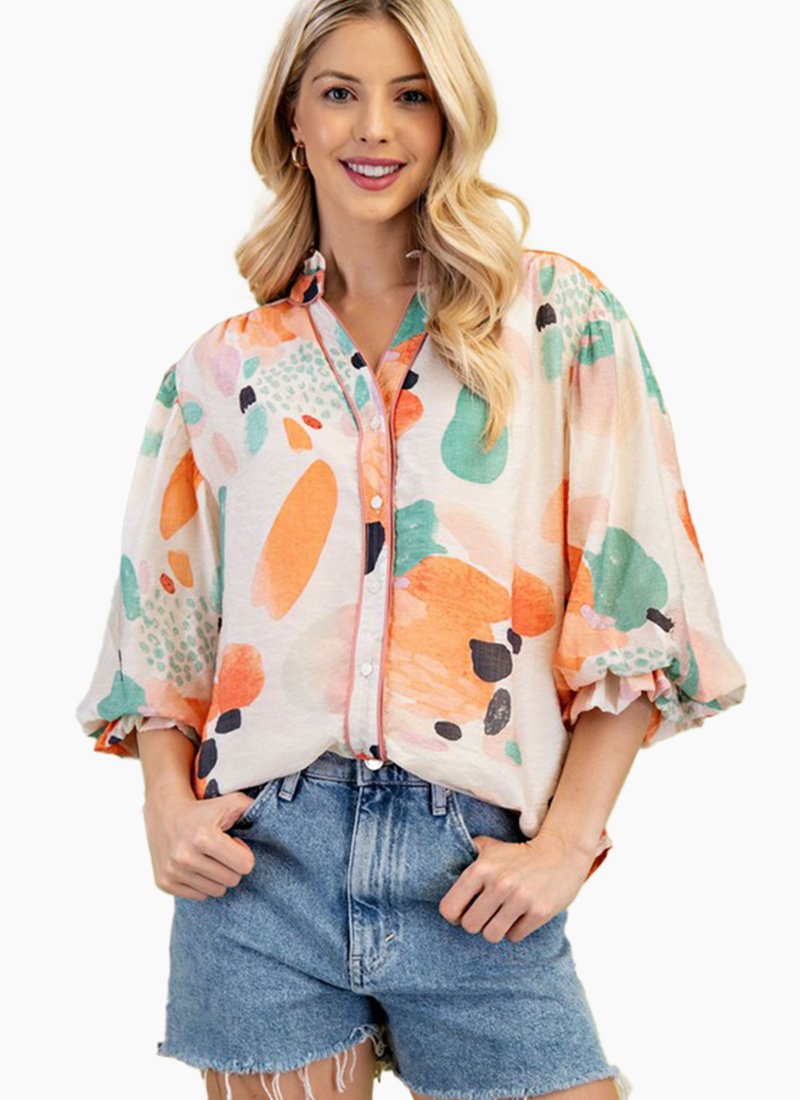Printed Blouse with Piping Detail and Gathered Balloon Sleeves