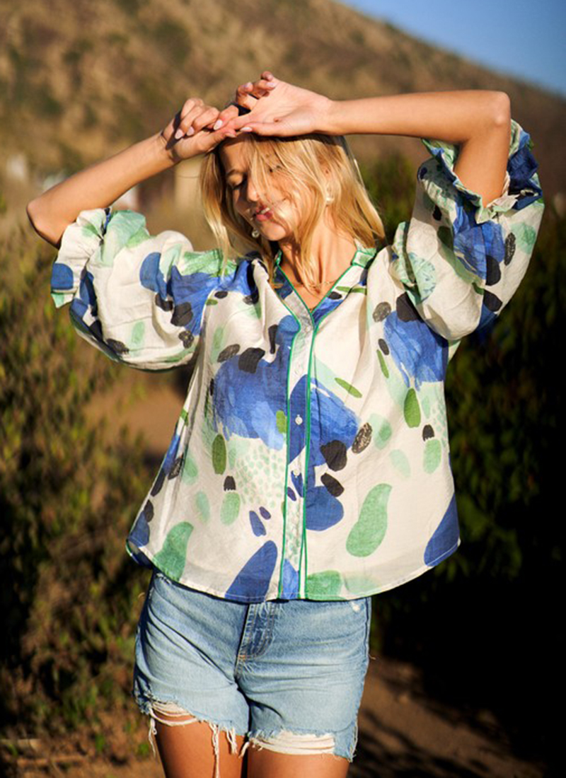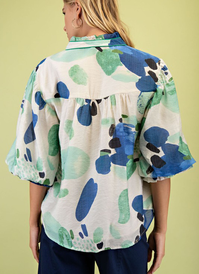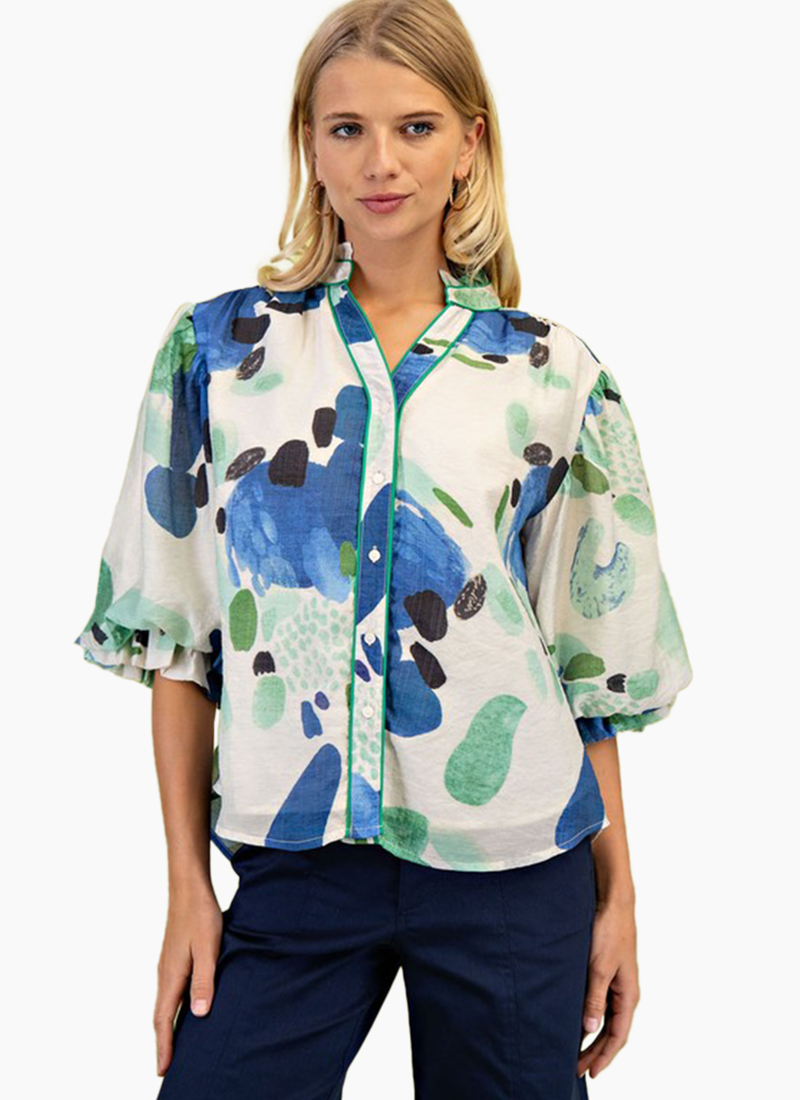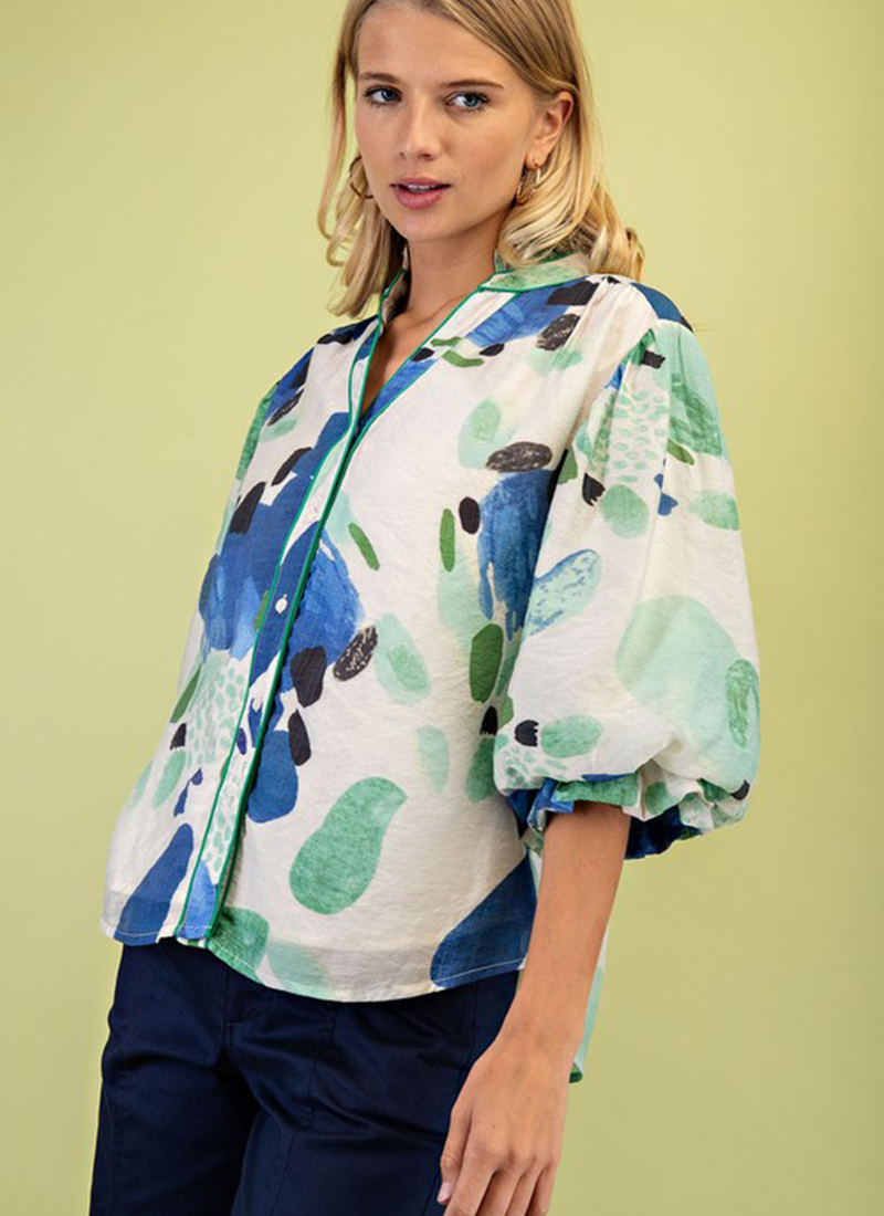 Printed Blouse with Piping Detail and Gathered Balloon Sleeves