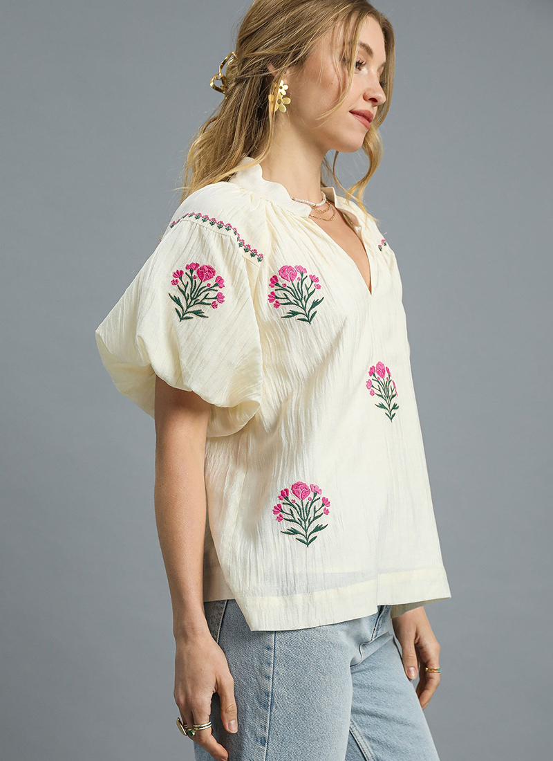 Floral embroidered puff sleeve blouse