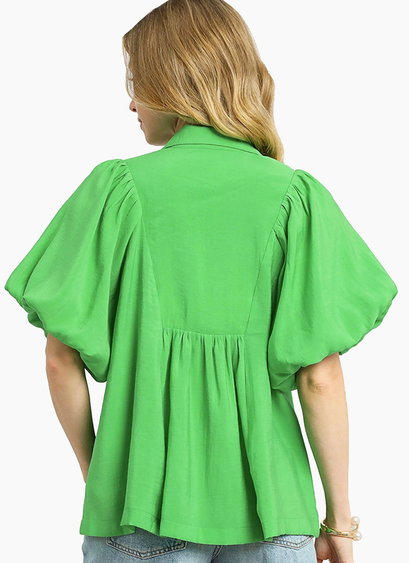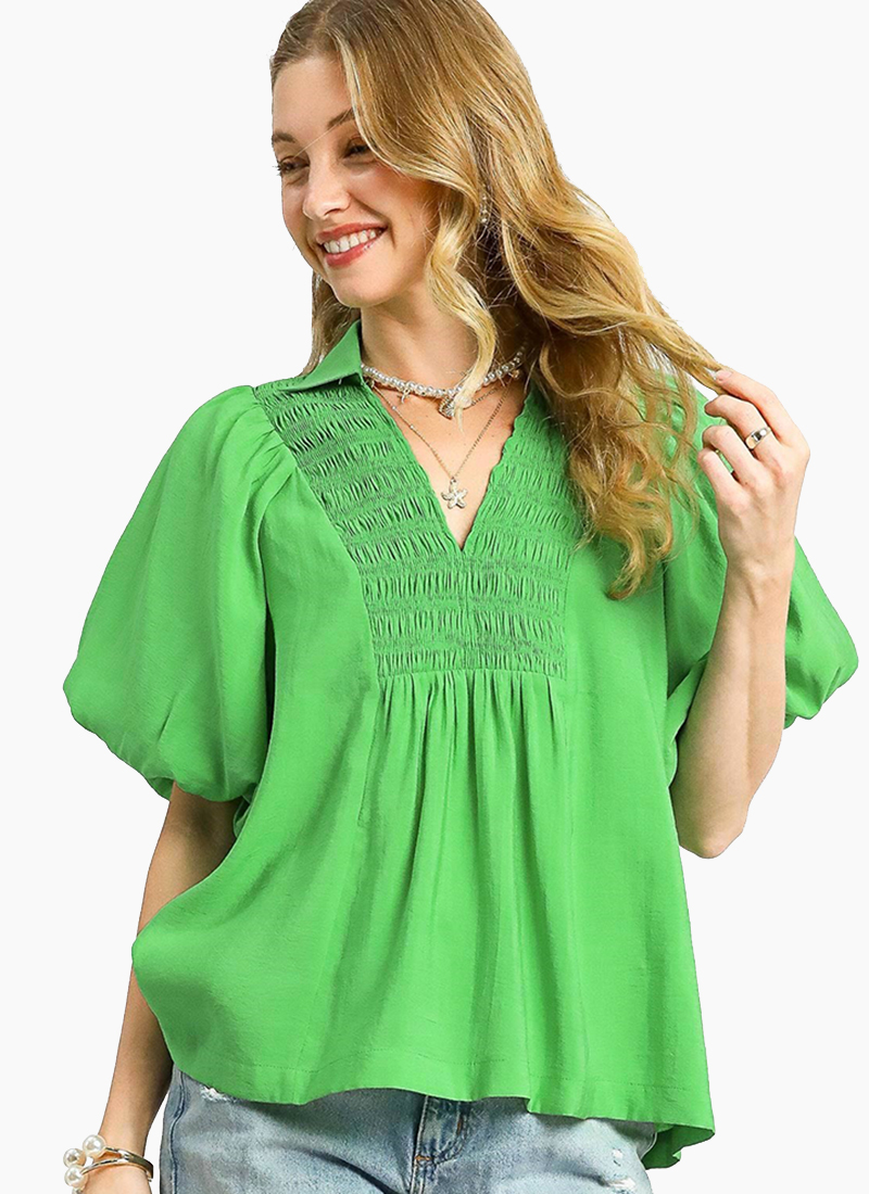Exaggerated bubble sleeve blouse with front yoke & smocking details