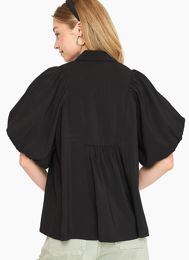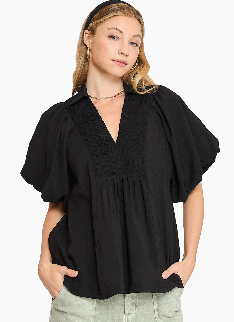 Exaggerated bubble sleeve blouse with front yoke & smocking details